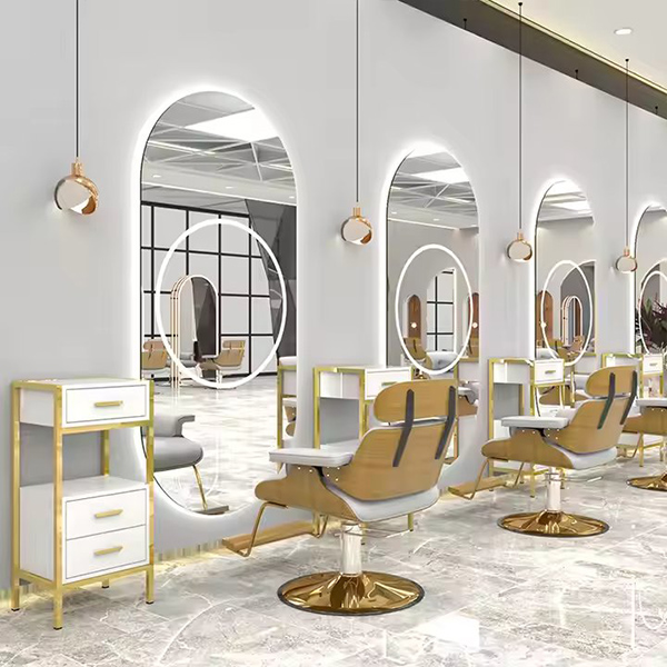 Luxury Gold Oval Barber Mirror Stations Hairdressing Salon Mirror Barber Unit Station with Led Light